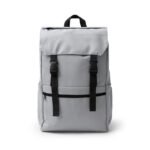“Backpack with flap made of 600D RPET. Flap with adjustable closures. Main compartment with interior pocket for 15″” laptop. Outer pocket on the flap and front pocket with zip closure and 2 side pockets with elastic. Padded handles and back.”