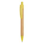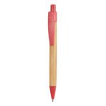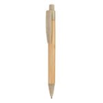 “Push button pen with bamboo body and tip, clip and push button in wheat fibre / ABS. Blue ink.”