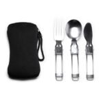 “Stainless steel folding cutlery set with practical neoprene case. Includes fork, knife, and spoon.”