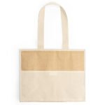 Cooler bag in laminated jute. Isothermic aluminium lining and velcro fastening. Keep your drinks and food at an adequate temperature. Front pocket and natural cotton handles.
