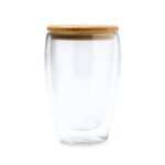 Double-walled glass made of borosilicate glass with bamboo lid. Perfect for gifting and surprising your customers. 350ml capacity.