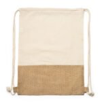 “Eco drawstring backpack made of 120 gsm cotton and jute in natural colour, with a section of jute on the lower part of the front side. Drawcords sewn to both lower corners.”