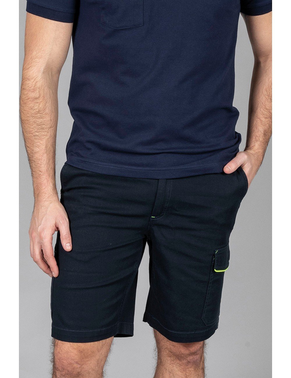 Προπλυμένο ύφασμα – 2 ιταλικές τσέπες – 1 τσέπη στο πλάι με velcro και φωσφορίζουσες κίτρινες λεπτομέρειες – Διπλή τσέπη για χάρακα και θήκη εργαλείων με κίτρινη λεπτομέρεια – 1 πίσω τσέπη με velcro – Ελαστική μέση και μεγάλα θηλύκια για τη ζώνη