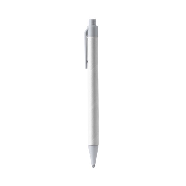 “Push-button pen with recycled cardboard body, tip and clip made from recycled ABS. Blue ink.”