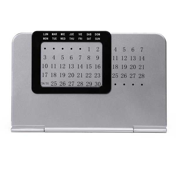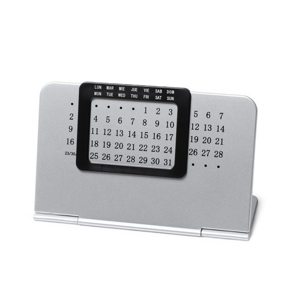 “Perpetual table calendar to be used any year, with two parts: one silver stand with numeric panel and a black