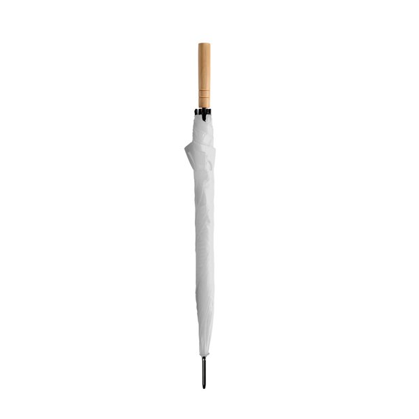 Umbrella with wooden handle and auto-opening. Ribs and tips in black. Velcro fastening.